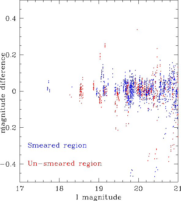 Smearing: The figure shows the effects of smearing on the photometry. The photometry on two overlapping images is compared in the smeared section |