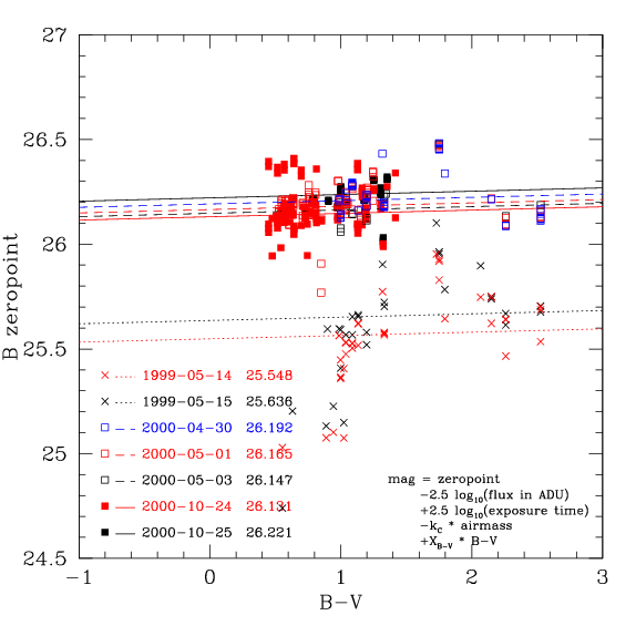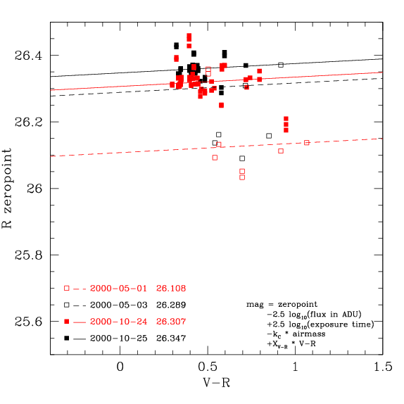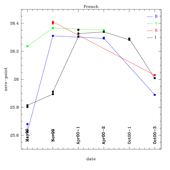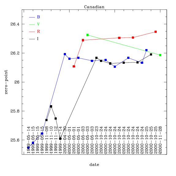 After the 1999 gain change, the behaviour of zero-points are mostly consistent with the Elixir data. The BI zero-points are about 0.15 mags fainter than the VR zero-points. The notable exception is the V zero-point from 2000-11-28 |