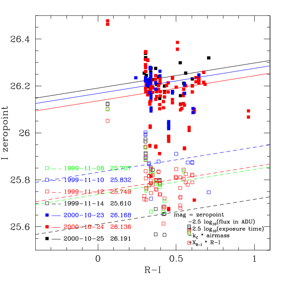 The lines show the zero-points. The colour terms from the table above determine the slope of the lines. In order to comput the intercept of the lines, the colour term is applied to all individual the zero-points, as described above. The median of the residuals give the zero-point at colour=0. The colour term is significant in the I band only. The zero colour zero-points for each night are noted on each graph. |