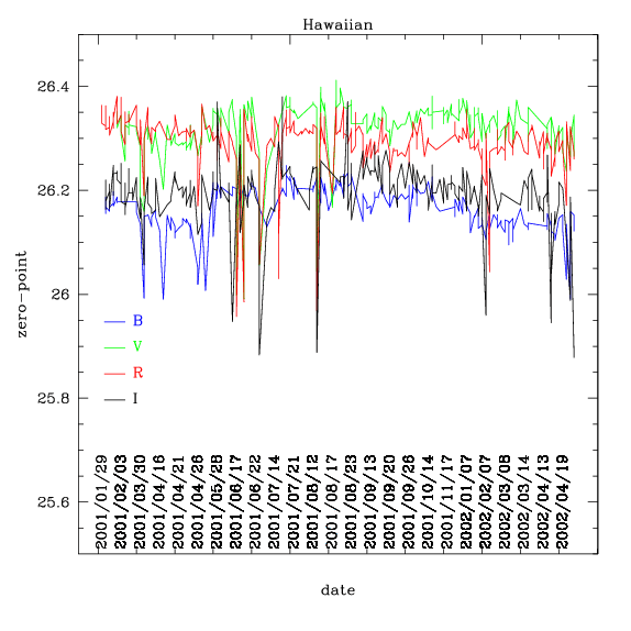 zero-points in the BVRI bands as a function of time.